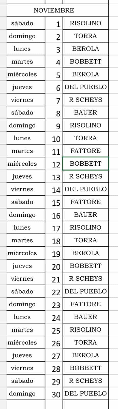 Farmacias de Turno en San Antonio de Areco para el mes de NOVIEMBRE 2025, con el siguiente formato día de la semana – día del mes – Farmacia de Turno en San Antonio de Areco